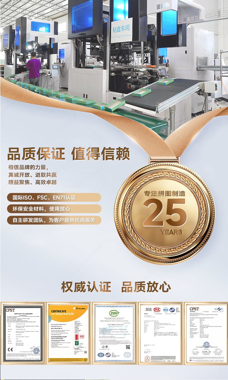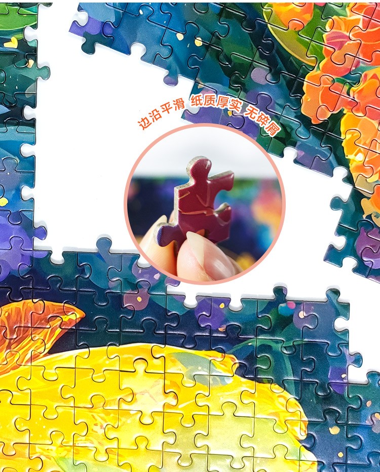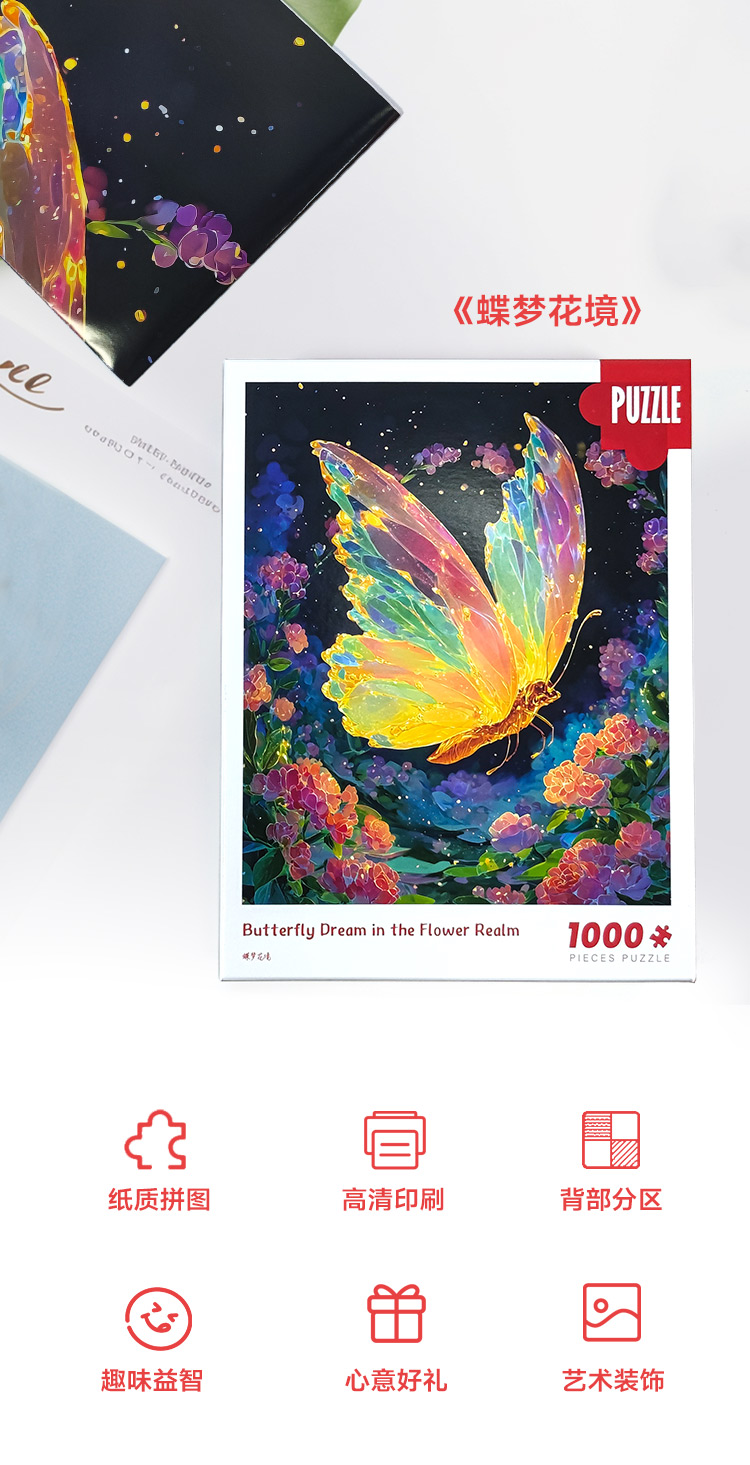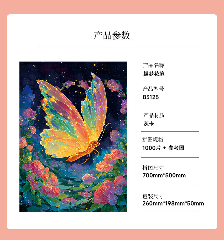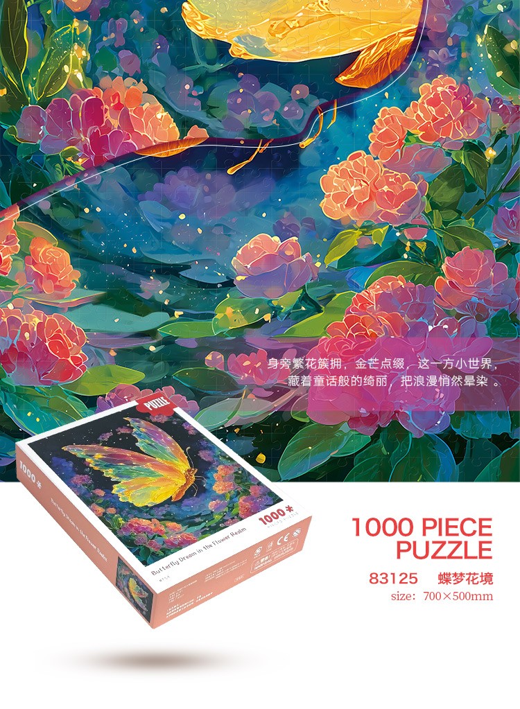 拼圖名稱:蝶夢花境-83125 拼圖尺寸:700*500MM 拼圖材質(zhì):紙質(zhì)灰卡 拼圖片數(shù):1000片 加工方式:廠規(guī)、來圖定制 包裝尺寸:180*130*50mm