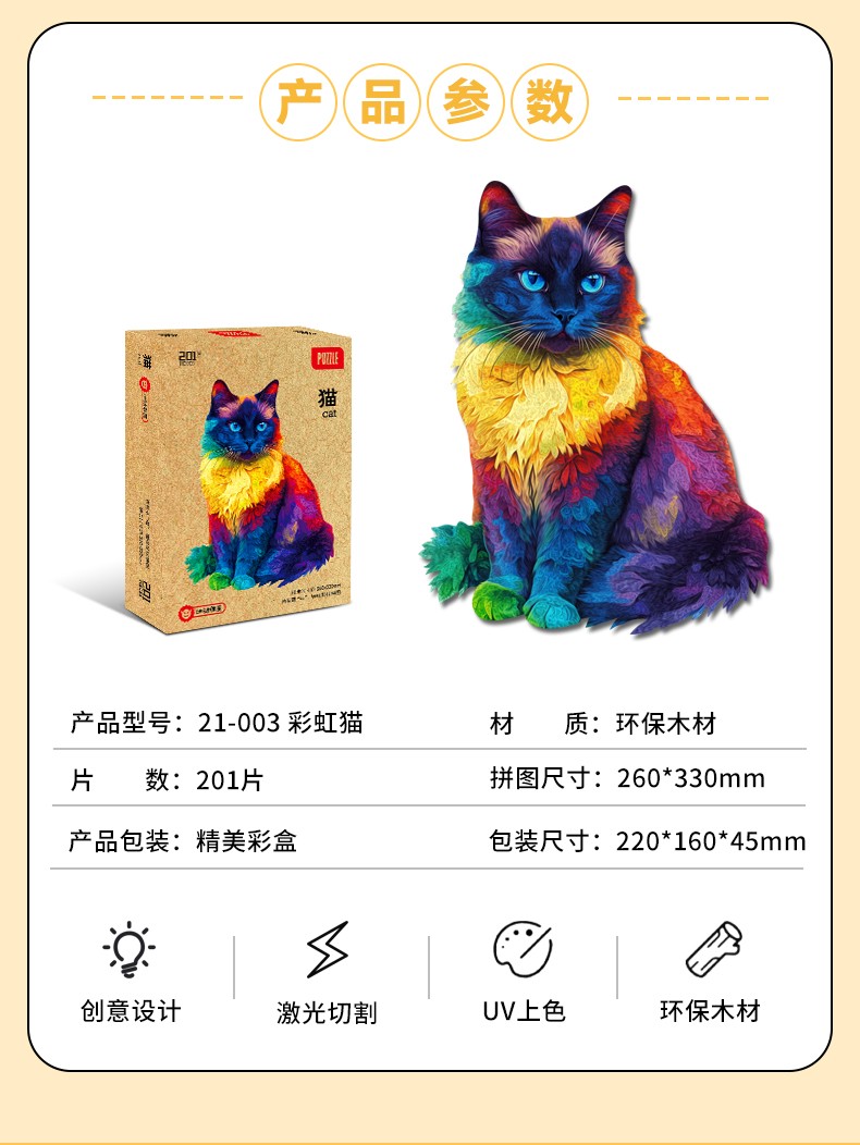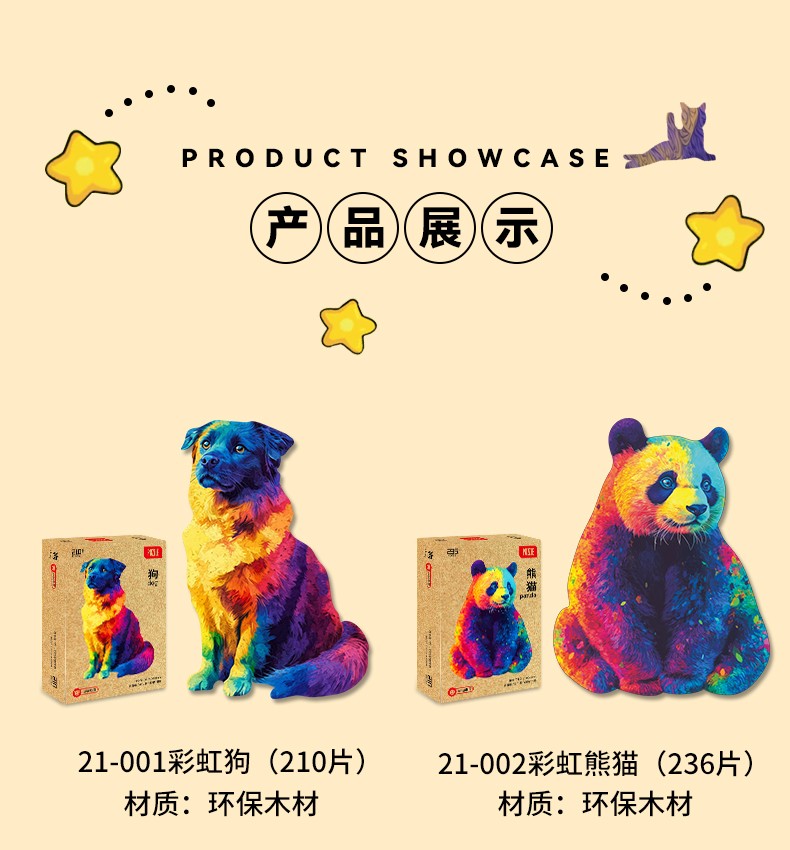 拼圖名稱:木制拼圖異形動物 拼圖尺寸:260*330*4.5MM 拼圖片數:201片 加工方式:廠規、來圖定制 包裝尺寸:220*160*45mm